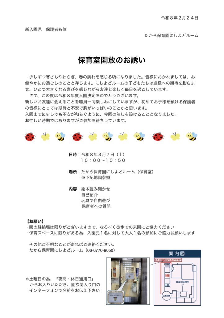 2026.02.24 たから保育園 にしよどルーム法人 【にしよどルーム】新入園児向け保育室開放のお誘い 保育室開放のお誘いについての詳細です。 添付資料をご確認ください。 ※このお誘いは令和8年度、たから保育園にしよどルームに入園するご家庭対象となります。 一覧へ戻る