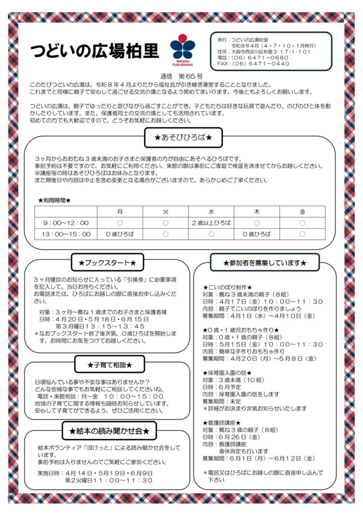 詳しいスケジュールや募集期間は、下記「つどいの広場通信」をご確認ください。